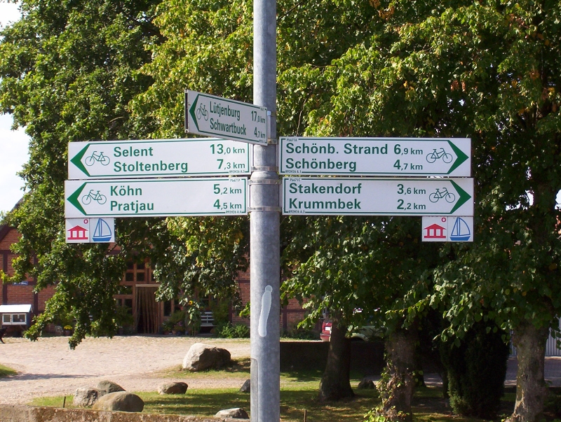 An der ersten Wegekreuzung in Pratjau (etwa 3 Kilometer nach unserer Rast am See) biegen wir zunächst nach "links" in Richtung Stoltenberg ab um dann nach ca. 1000 Metern der Beschilderung nach Sophienhof/Bendfeld zu folgen. Ab Bendfeld ist bereits Stakendorf ausgeschildert. Hinter Bendfeld überqueren wir die K 13 und folgen dem sich anschließenden Spurplattenweg bis zur K 38 (ca. 2 km). Stakendorf liegt jetzt vor uns.